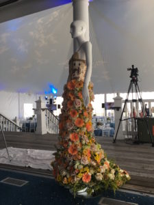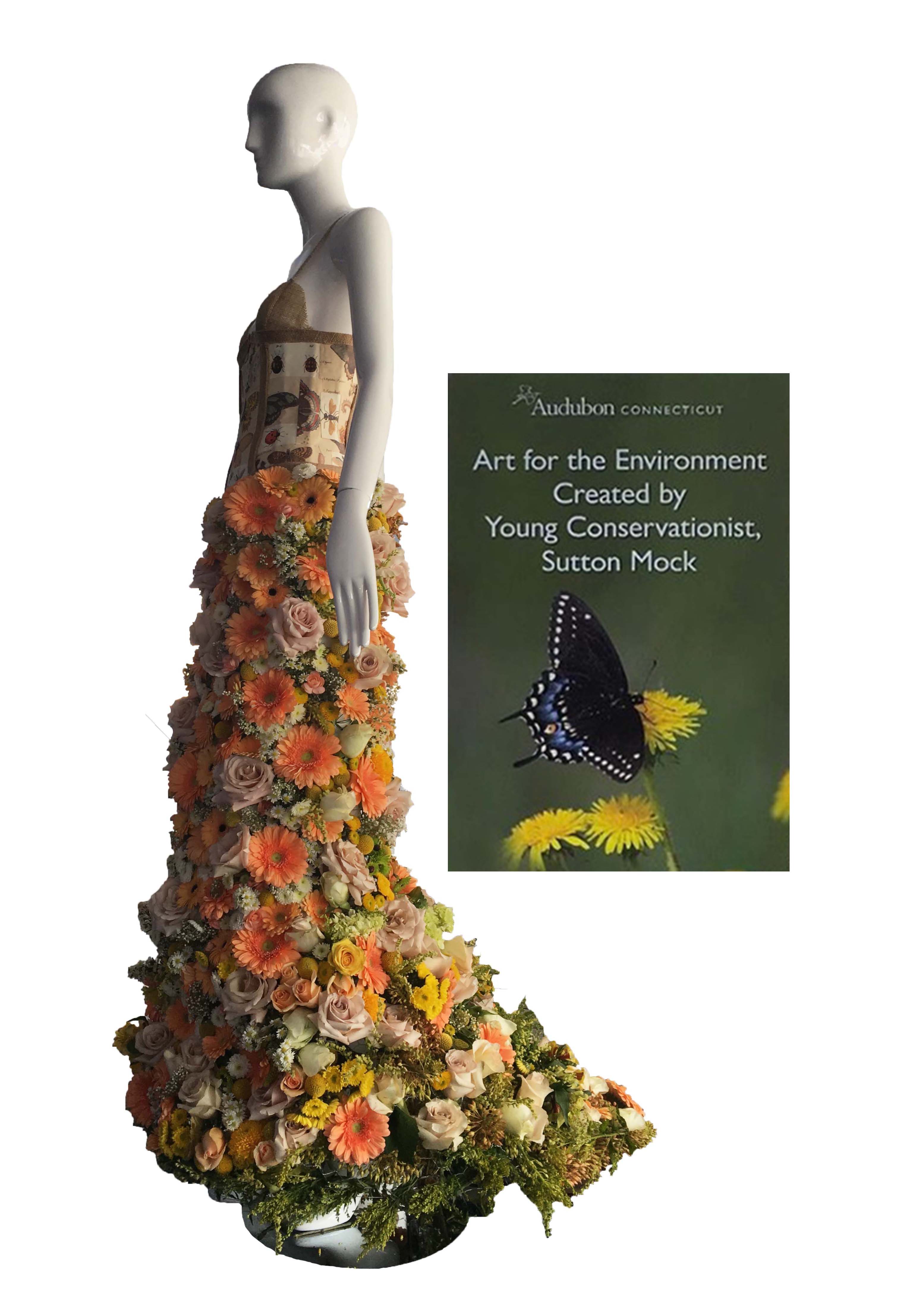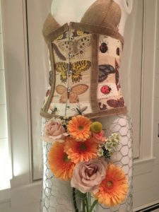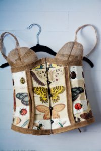 corset made with collage and burlap, skirt made with fresh flowers and chicken wire
